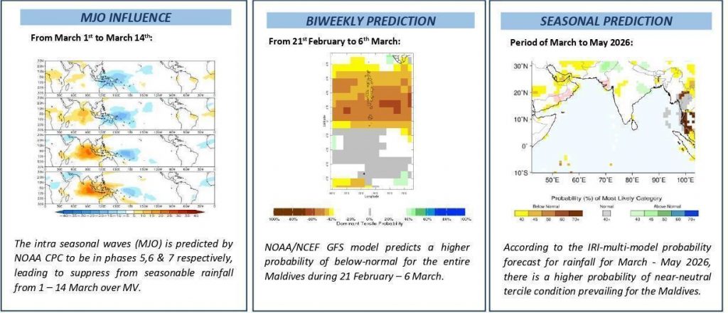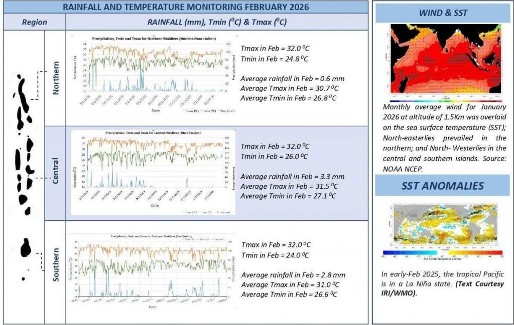 In February, the southern islands received 2 – 5 mm of rainfall and the remaining islands received less. North-Easterly winds prevailed for the northern islands; while North-Westerly winds prevailed for the central and southern islands of Maldives during the month of January.