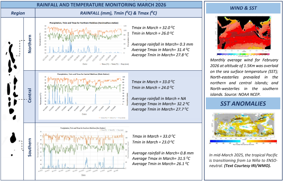 In March, there was no rainfall recorded across most areas during 17 – 31. Maximum temperature of 33°C was recorded in the central and southern Maldives. Sea surface temperature (SST) around the Maldives and the Arabian Sea remains normal. As of mid-March, Pacific Ocean is transitioning from a La Niña state towards ENSO-neutral. Winds are mainly coming from the northeast and northwest across the country.