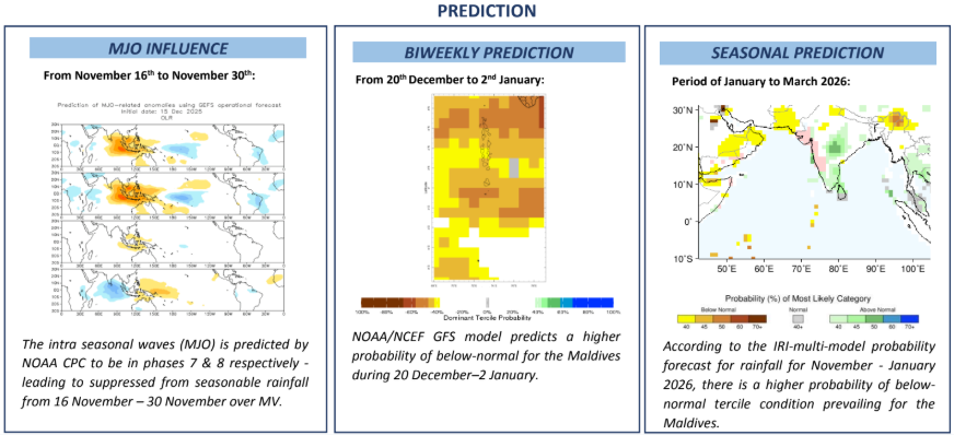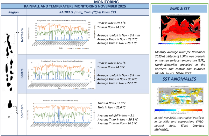In November, the central islands received up to 12 mm of rainfall and the remaining islands received less. North-Westerly winds prevailed for the Maldives during the month of November.